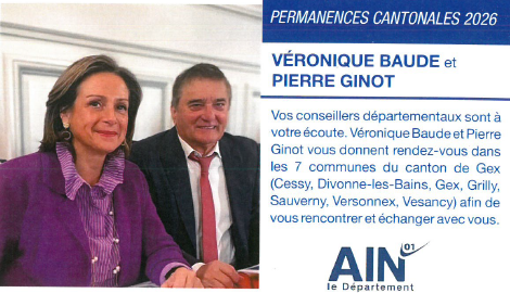 Madame Véronique BAUDE, conseillère départementale, aura le plaisir de vous recevoir en Mairie de Grilly le mardi 24 février prochain de 18 à19 heures.