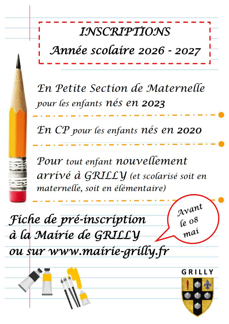 Pour cela, nous vous demandons de préinscrire vos enfants en mairie de GRILLY pour la rentrée scolaire prochaine – année 2026 / 2027 – si :